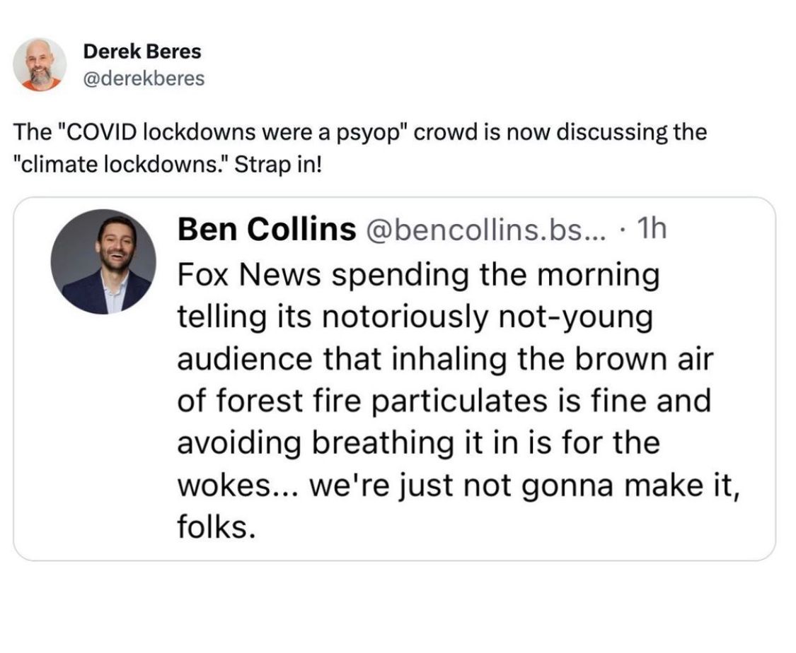 This is a fire that has been burning thousands of acres for weeks on end, continuously, all of its smoke rising into the atmosphere so heavily and in such concentrations it is visible from space. That smoke has traveled, is traveling, hundreds of miles south from Ontario and Quebec, and in that movement has lost to gravity and precipitation all but the lightest and smallest of its particulate matter. When it settles on the northeast US, it nearly blocks out the sun in midday and fills the air with a faintly acrid scent. But you don’t cough, not right away, no. The air is more air than smoke, you don’t cough it out. You breathe it in. You breathe material so small it passes through your lungs directly into your bloodstream. You don’t cough right away, but hours and days later, you complain of a headache. Because it’s far too late to cough. It’s in you, and it is doing its damage. Continuously, with every breath, you absorb more and more of it into your body, and new concentrated clouds form inside you.